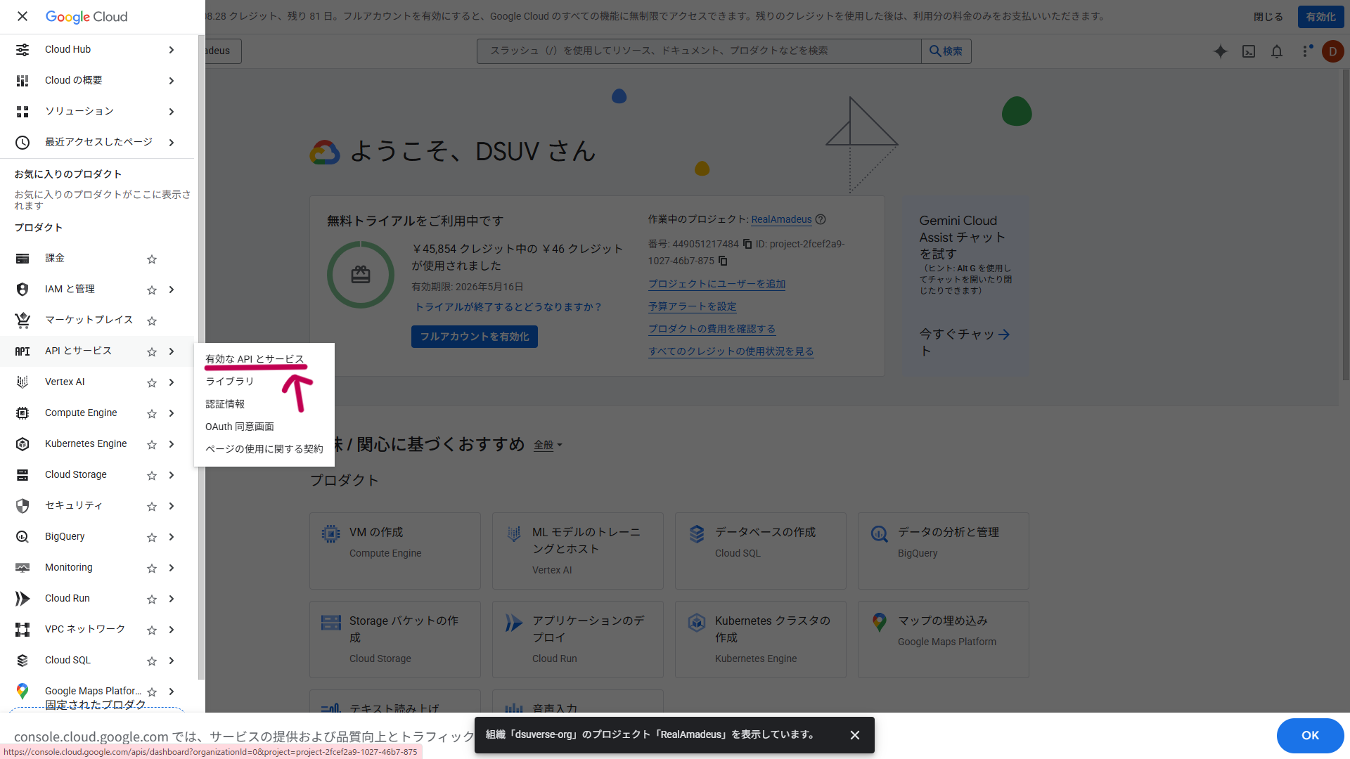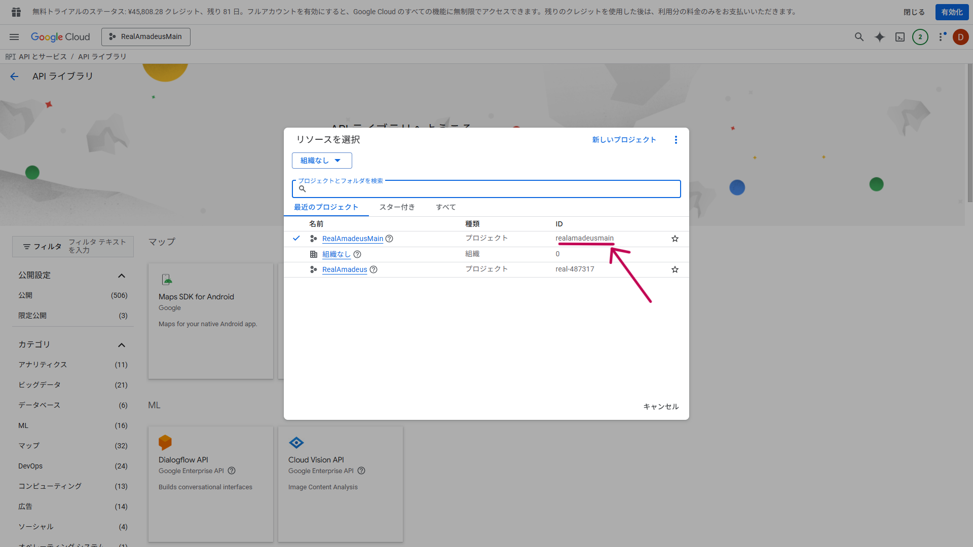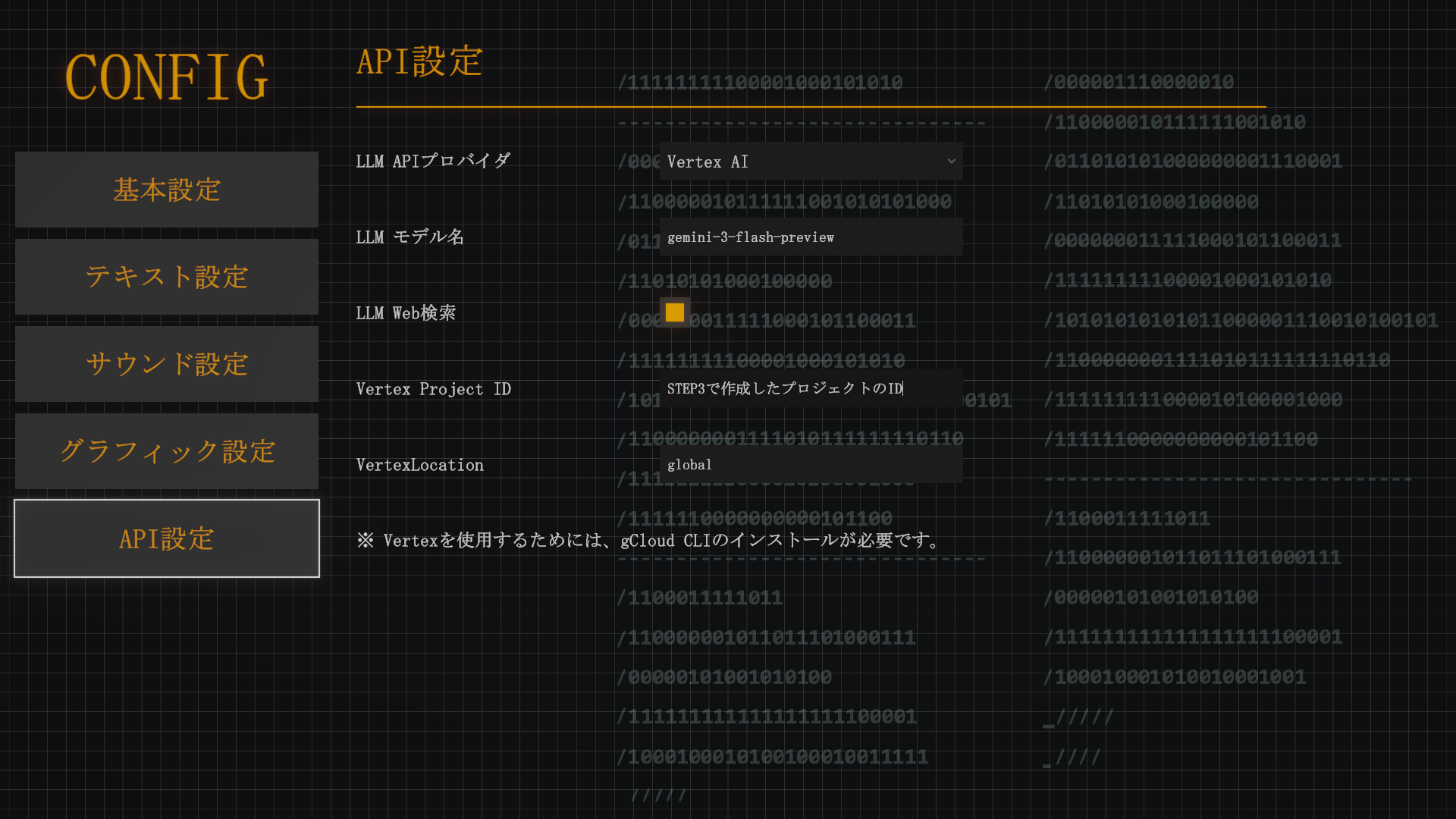 STEP3で作成したプロジェクトのIDを確認します。システムメニューのCONFIGから「Vertex AI」を選択し、利用するプロジェクトIDとモデル名(例: gemini-3-flash-preview)を設定します。認証トークンはシステムがgcloud経由で自動取得します。
